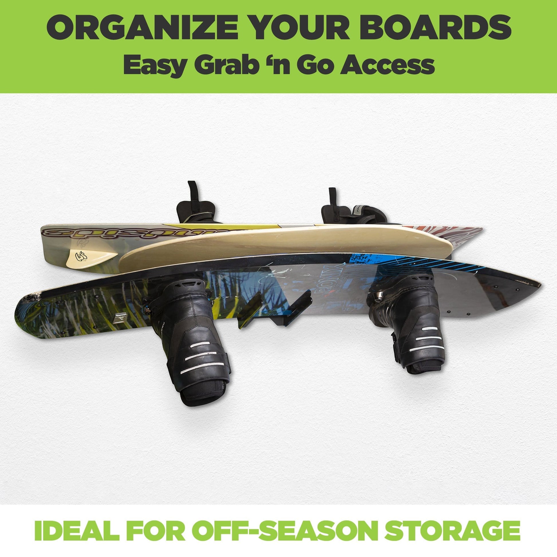 Tired of bulky wakeboards taking up space in your garage? The HIDEit MBoard is the perfect solution to organize and safely store your boards in the offseason. Made from heavy-duty steel, our board mount is strong enough to hold a combination of boards, so mix in your longboards, wakeboards and skimboards! The powder-coated and rubber dipped steel protect your boards from scratches and won’t rust in marine environments. The 1.25’’ gap between arms holds most medium size boards and water skis. Plus the single-piece design makes installation easy! It's the ideal board rack!